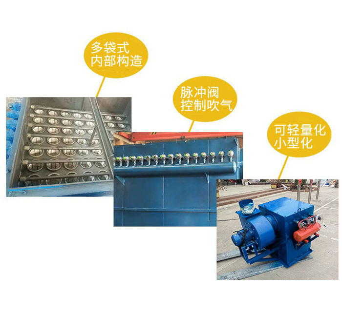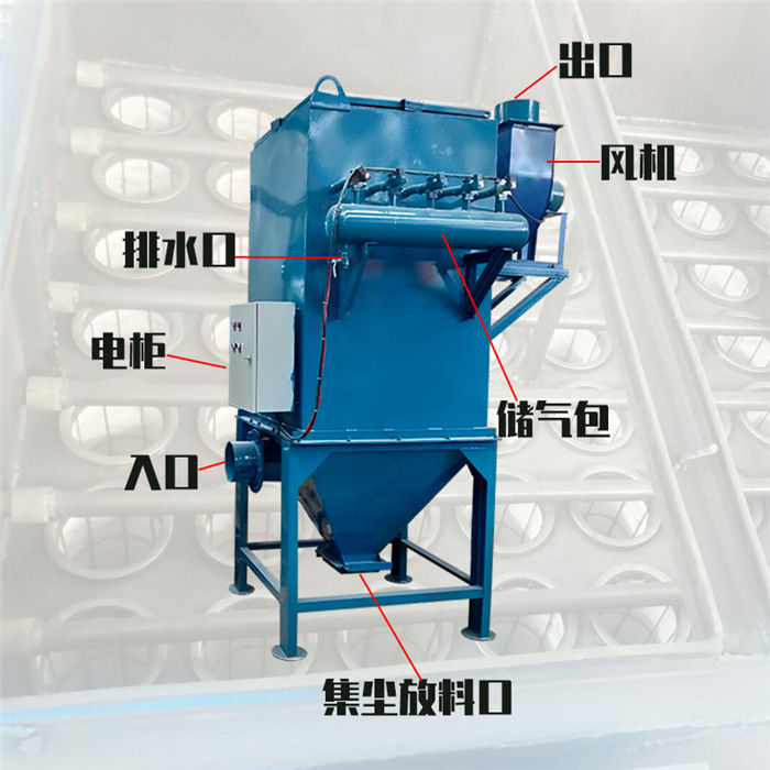 該設備為多袋式脈沖除塵裝置,當含塵氣體由進風口進入除塵器,首先碰到進出風口中間的斜板及擋板,氣流便轉向流入灰斗,同時氣流速度放慢,由于慣性作用,使氣體中粗顆粒粉塵直接流入灰斗。起預收塵的作用,進入灰斗的氣流隨后折而向上通過內部裝有金屬骨架的濾袋粉塵被捕集在濾袋的外表面,凈化后的氣體進入濾袋室上部清潔室,匯集到出風口排出,含塵氣體通過濾袋凈化的過程中,隨著時間的增加而積附在濾袋上的粉塵越來越多,增加濾袋阻力,致使處理風量逐漸減少,為正常工作,要控制阻力在一定范圍內(140--170毫米水柱),必須對濾袋進行清灰,清灰時由脈沖控制儀順序觸發各控制閥開啟脈沖閥,氣包內的壓縮空氣由噴吹管各孔經文氏管噴射到各相應的濾袋內,濾袋瞬間急劇膨脹,使積附在濾袋表面的粉塵脫落,濾袋得到再生。清下粉塵落入灰斗,經排灰系統排出機體。由此使積附在濾袋上的粉塵周期地脈沖噴吹清灰,使凈化氣體正常通過,保證除塵系統運行。