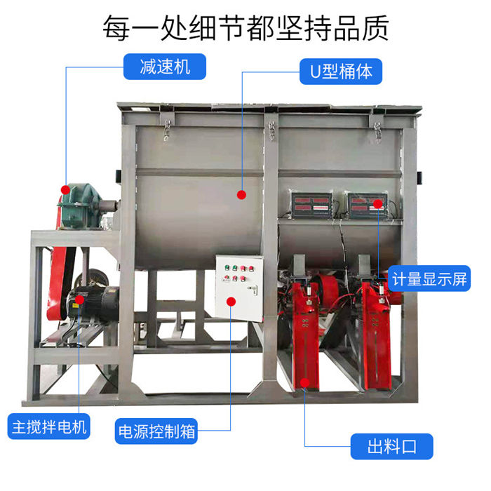 該設(shè)備為全自動(dòng)干粉砂漿攪拌機(jī),整機(jī)四角加上料計(jì)量,適合多種物料混合的攪拌,設(shè)定好斤稱之后,物料由提升機(jī)上料,斤稱達(dá)到自動(dòng)停止,然后接著上第二種物料,以此類推,計(jì)量準(zhǔn)確,省時(shí)省力;出料系統(tǒng)設(shè)計(jì)也是電腦計(jì)量裝置,無(wú)需人工二次稱重,閥口袋包裝,無(wú)需再次封口,出料速度快,4秒一袋,1人即可操作,省時(shí)省力;攪拌機(jī)機(jī)身為臥式U型筒體,內(nèi)部由內(nèi)外兩層螺帶交錯(cuò)布置,攪拌均勻,混合速度快,5至8分鐘即可攪拌均勻,出料可根據(jù)不同物料的實(shí)際需求定做多個(gè)出料口。