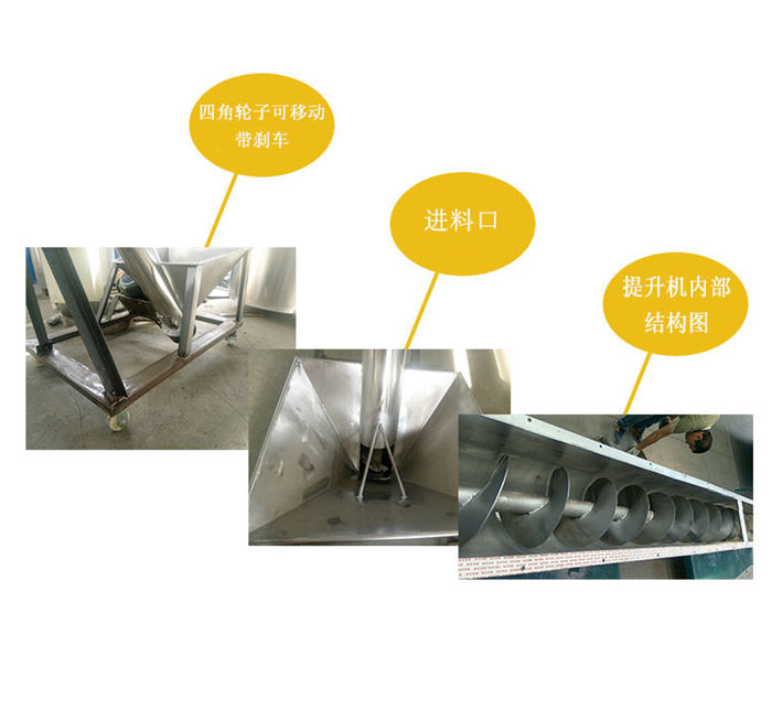 螺旋提升機(jī)產(chǎn)品概述該機(jī)適用于食品、醫(yī)藥、化工、塑料等行業(yè)的粉粒狀物料的輸送。可以與我司包裝機(jī)配套實(shí)現(xiàn)料位跟蹤自動(dòng)供料,也可單獨(dú)在其它場(chǎng)合使用。除電機(jī)、軸承、機(jī)架外其余為不銹鋼制成。可隨意移動(dòng),在水平、傾斜、垂直等位置均能連續(xù)輸送,它具有良好的密封性,無粉塵泄漏。可直接與其配套的設(shè)備連接固定,不需要地基基礎(chǔ),充分利用廠房空間。